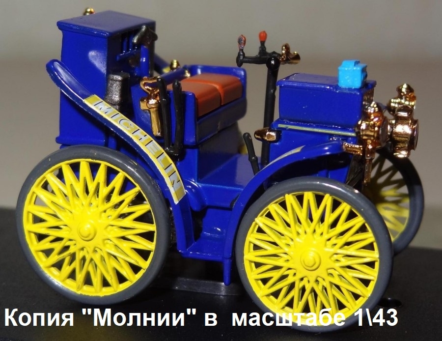 В 1895-м году они приобрели подержанное шасси Peugeot с двигателем мощностью в половину лошадиной силы. Инженеры Michelin демонтировали родной двигатель и установили имевшийся двигатель Daimler. Так как он был больше, сзади появился объемный ящик – двигательный отсек. Автомобиль стал тяжелее, и очень трудно управляем. Eго не возможно было удержать на прямой, поэтому он постоянно двигался зигзагами, за что и получил прозвище - «Молния». Далее оснастили «Молнию» подобными пневматическим покрышками и стали участниками автогонок Париж-Бордо, преодолев 1200 километров.